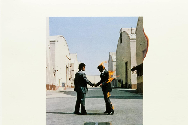 Oltre al tributo a Barrett, “Wish You Were Here” esplora il rapporto tra gli artisti e il mondo del business. La copertina, firmata da Storm Thorgerson e Aubrey “Po” Powell dello studio Hipgnosis, rappresenta questa tematica attraverso l’immagine di due uomini che si stringono la mano, mentre uno dei due è avvolto dalle fiamme. La foto, realizzata con stuntmen e fiamme reali, simboleggia l’artista che rischia di essere “bruciato” dalla stretta di mano con il mondo degli affari.