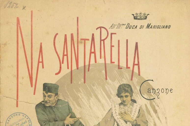 Tra i documenti dell’archivio Bideri in esposizione, spicca lo spartito di *Na santarella*, una curiosa canzone autocelebrativa in cui Scarpetta racconta il successo di pubblico dell’omonima commedia, descrivendo una scena al botteghino del teatro Sannazaro. La mostra propone inoltre l’elenco dei 160 canti di scena firmati dal commediografo, soffermandosi su quelli che elaborò riscrivendo testi di canzoni napoletane composte da altri, come ad esempio *Tarantelluccia* e *Comme facette mammeta*, rilette per la rivista *L’ommo che vola* del 1909, o *Surdate*, rifatta per un’edizione di *Guerra agli uomini* successiva al 1906.