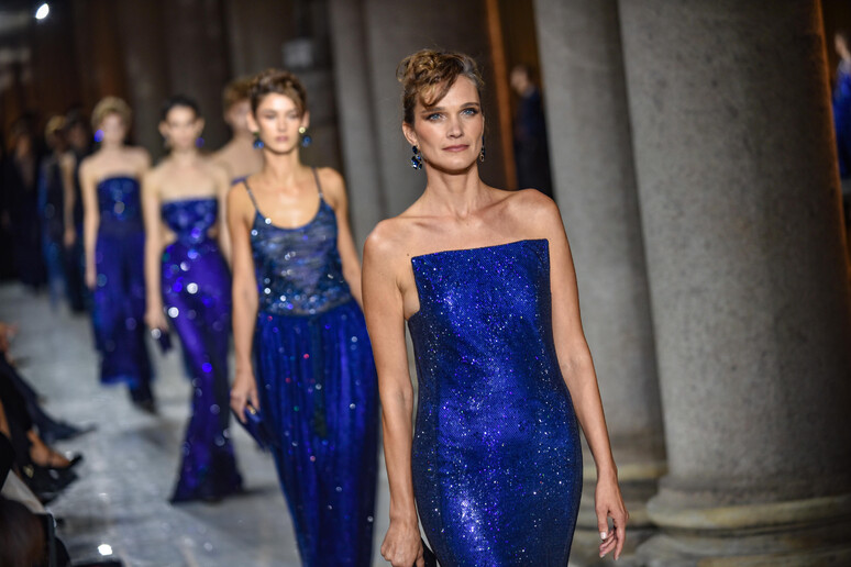La collezione presentata, pensata per la prossima estate, ha unito due luoghi fondamentali nella vita di Giorgio Armani: Milano, la città del lavoro, e Pantelleria, l’isola rifugio. Un testamento di stile in cui tutto è fluido, leggero, pensato per sedurre con energia, seguendo l’idea armaniana di purezza come armonia tra abito e persona. I tessuti si muovono come accarezzati dal vento dell’isola, le linee sono allungate, sia nei completi che negli abiti delicati ed eterei. I colori raccontano storie di luce, terra e mare, dai neutri organici ai blu notturni, fino alle note preziose e vivaci. Una sinfonia di bellezza che ha commosso profondamente i presenti.
