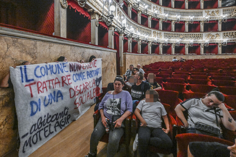 La protesta nasce dalla disperazione di 28 famiglie, alcune residenti nell’ex motel Agip da oltre vent’anni, che si trovano ad affrontare l’imminente sgombero senza adeguate alternative abitative. Dopo giorni di manifestazioni davanti alla sede del Comune, senza ottenere un incontro con l’amministrazione, i residenti hanno deciso di portare la loro battaglia nel ‘salotto della cultura cittadina’, come lo hanno definito. Incatenati alle poltrone della platea, hanno esposto uno striscione eloquente: ‘Il Comune non ci deve trattare come abitanti di una discarica sociale’.