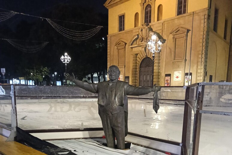 PESARO – Un omaggio trasformato in “ridicolizzazione”. È un’autentica bufera quella che si è abbattuta sull’amministrazione comunale di Pesaro, finita al centro di un caso di rilevanza nazionale per la scelta di allestire la tradizionale pista di pattinaggio natalizia attorno alla statua in bronzo del Maestro Luciano Pavarotti. L’installazione, situata in piazzale Lazzarini, a pochi passi dal Teatro Rossini, ha di fatto “ingabbiato” l’opera che ritrae il celebre tenore a braccia aperte, scatenando l’indignazione di cittadini, opposizioni e, soprattutto, della vedova Nicoletta Mantovani.
