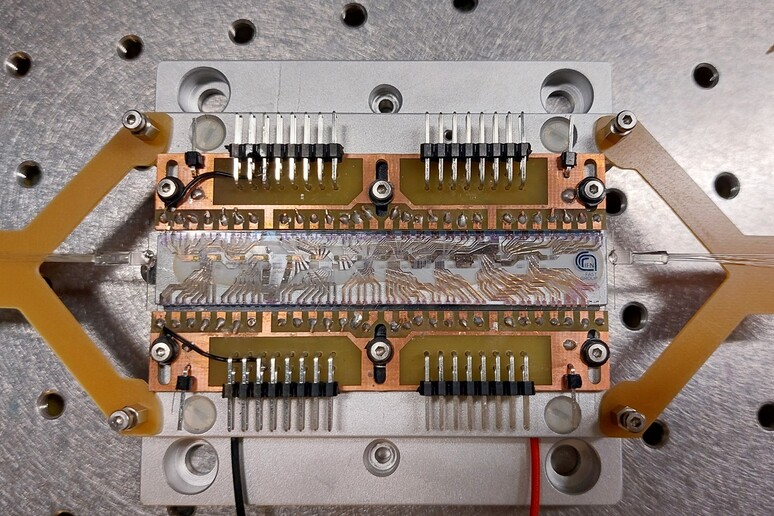 Il cuore di Qolossus 2.0 è un processore fotonico integrato, un chip interamente realizzato in Italia dai ricercatori del CNR-IFN di Milano. Roberto Osellame, direttore di ricerca dell’istituto, ha spiegato come, grazie a una tecnologia di nanofabbricazione sviluppata negli ultimi 20 anni che utilizza impulsi laser ultrabrevi, sia possibile “scrivere” circuiti ottici direttamente all’interno di un substrato di vetro. Questa tecnica permette di creare processori fotonici allo stato dell’arte, competitivi a livello mondiale.