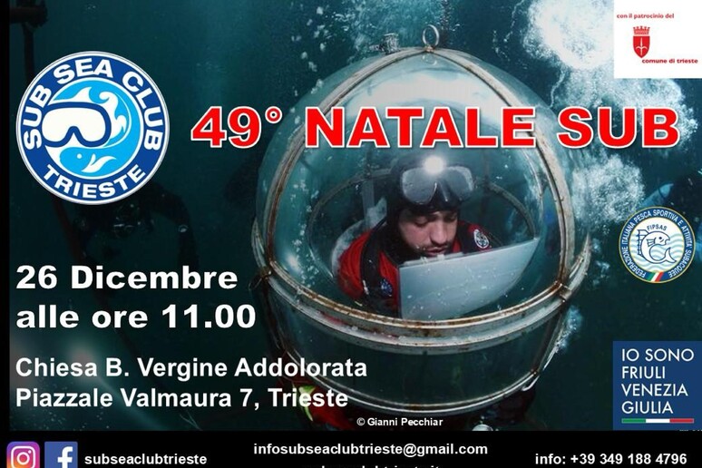 Il Natale Subacqueo non è solo un evento, ma un pezzo di storia e cultura della città di Trieste. Nato nel 1976 come un semplice ritrovo tra soci del club per uno scambio di auguri, si è trasformato negli anni in un appuntamento irrinunciabile per tutta la gente di mare: sub, sportivi, pescatori e professionisti del settore. La cerimonia, unica nel suo genere in Italia, prevede normalmente la celebrazione della Messa a terra e, a seguire, l’immersione del sacerdote, don Francesco Pesce, anch’egli subacqueo brevettato.