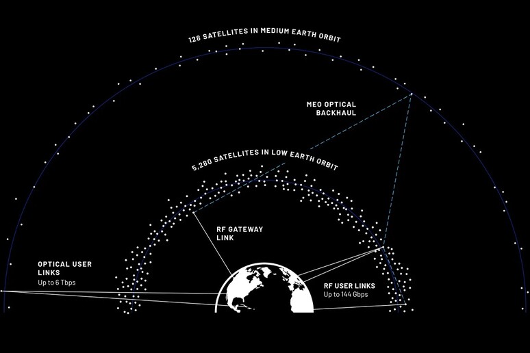 Nel cuore del progetto TeraWave c’è una dualità strategica. La costellazione sarà composta da ben 5.280 satelliti in orbita terrestre bassa (LEO) e 128 satelliti in orbita terrestre media (MEO). Questa configurazione non è casuale. I satelliti LEO, orbitando a quote più basse (tra 520 e 540 km), garantiranno una bassa latenza, fondamentale per applicazioni in tempo reale, e offriranno connessioni a radiofrequenza (bande Q/V) con velocità che potranno raggiungere i 144 gigabit al secondo (Gbps) per singolo utente.