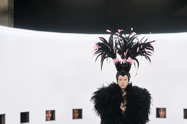 La collezione “Specula Mundi” (Specchio del Mondo) è un’archeologia dell’immaginario che spazia dalle dive della vecchia Hollywood alle divinità antiche, passando per iconografie religiose. Hanno sfilato sontuosi mantelli di velluto ricamati con paillettes, copricapi scultorei adornati da piume di marabù, colletti giganti e gorgiere che sembravano corolle di fiori. E ancora, velluti a profusione, fiocchi monumentali e abiti da red carpet resi sensuali da audaci cut-out velati di cristalli. Ogni creazione è un microcosmo di riferimenti, un “ritratto” che celebra l’eccezionale lavoro artigianale dell’atelier Valentino, vero custode del saper fare dell’Haute Couture.