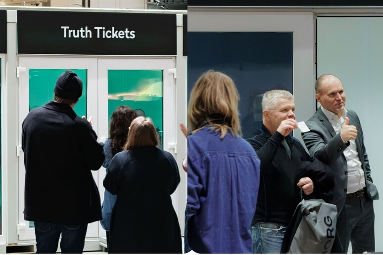 Per tradurre questo concetto in un’esperienza tangibile e audace, gli organizzatori hanno introdotto i “Truth Tickets”. Un’iniziativa tanto singolare quanto potente: i visitatori hanno potuto “acquistare” i biglietti non con denaro, ma dicendo la verità mentre erano collegati a una macchina della verità, un poligrafo professionale. Una ‘macchina della verità’ è stata installata in un centro commerciale, invitando i passanti a sottoporsi al test. “Sono stata la prima a provarlo”, ha raccontato sorridendo la stessa Lundgren, “Già da quando hanno iniziato ad attaccare tutti i fili mi è salita la pressione ma è stato divertente”. Un esperimento sociale che trasforma l’onestà in una valuta alternativa, una chiave d’accesso alla cultura.