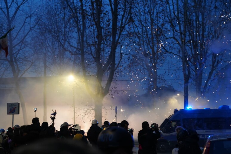 A quel punto, è iniziato un fitto lancio di oggetti contro il cordone di polizia schierato a protezione dell’area: bombe carta, razzi, fuochi pirotecnici, pietre e bottiglie. Le forze dell’ordine hanno risposto con cariche di alleggerimento, l’uso di gas lacrimogeni e idranti per disperdere la folla. Gli scontri si sono protratti per circa un’ora e mezza, estendendosi anche ad aree limitrofe come la zona del campus universitario Einaudi. Durante i disordini sono stati incendiati numerosi cassonetti dei rifiuti e persino un’autoblindo della polizia è stata data alle fiamme.