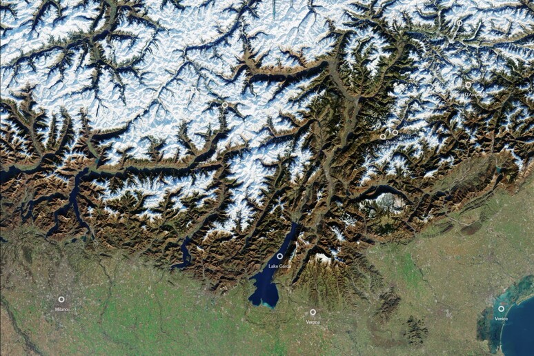 L’immagine, elaborata e diffusa dall’Agenzia Spaziale Europea (ESA) in collaborazione con la Commissione Europea, mostra un panorama quasi completamente privo di nuvole, dominato dall’imponente arco alpino le cui cime innevate si stagliano come vene bianche su un tessuto montuoso. È qui, tra queste valli e picchi, che si concentra il cuore pulsante dei Giochi, un palcoscenico diffuso che abbraccia un’area di oltre 22.000 chilometri quadrati tra Lombardia, Veneto e Trentino-Alto Adige.