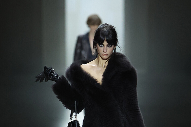 Inevitabili e voluti i richiami all’era di Tom Ford, che negli anni ’90 ridefinì l’estetica di Gucci all’insegna di una sensualità audace. Il finale dello show ne è la prova più evidente: una statuaria Kate Moss ha calcato la passerella indossando un abito da sera nero con una profonda scollatura sulla schiena, che rivelava un perizoma con il logo GG in oro bianco e diamanti. Un omaggio diretto e potente a un’estetica che ha segnato un’epoca d’oro per il brand. Non mancano, tuttavia, cenni più discreti all’immediato predecessore, Alessandro Michele, presente in prima fila accanto a Donatella Versace, come nelle ciabatte con pelliccia.