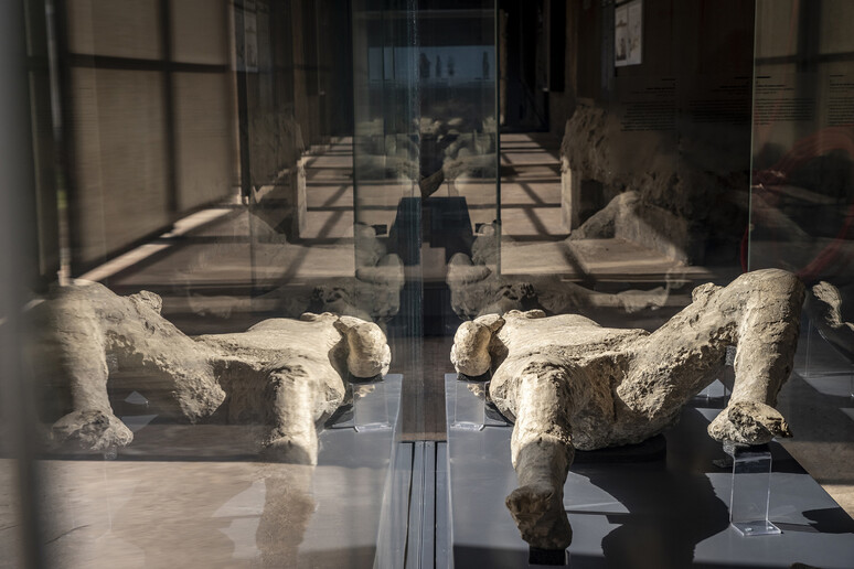 I 22 calchi esposti provengono da diversi contesti della città antica, dalle domus del centro urbano alle strade e alle porte, lungo le quali molti cercarono una disperata e vana via di fuga. Per la prima volta, un numero così significativo di queste testimonianze è riunito in un unico luogo. Si possono osservare le forme contorte di chi cercava riparo, un bambino stretto alla madre, una coppia di amanti, figure che narrano storie universali di amore e terrore. Sono “persone vere“, come le ha definite Zuchtriegel, che la scienza ci restituisce in tutta la loro tragica umanità.
